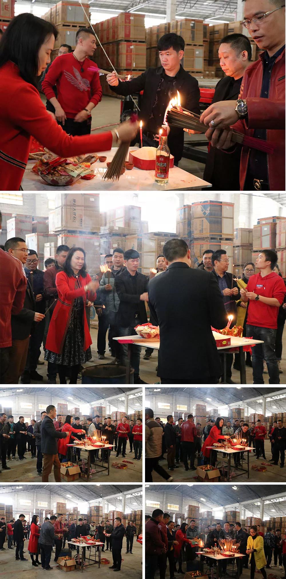 全體人員拜完“關(guān)公”后進(jìn)入到生產(chǎn)車間,進(jìn)行“安全生產(chǎn)”敬拜儀式,神明在上,心誠(chéng)則靈,大家手捧焚香恭恭敬敬進(jìn)行了敬拜,但愿新的一年生產(chǎn)平平安安,貨如輪轉(zhuǎn)。