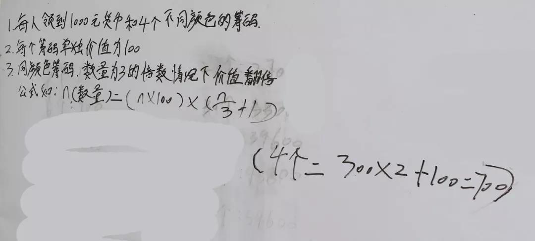 總結(jié)過后,很快大家進入到了本輪的”誰是大贏家“環(huán)節(jié),每個成員手上各發(fā)放1000元現(xiàn)金和4個顏色不同的價值100元的籌碼,如此每人手上各有起動資金1400元整。