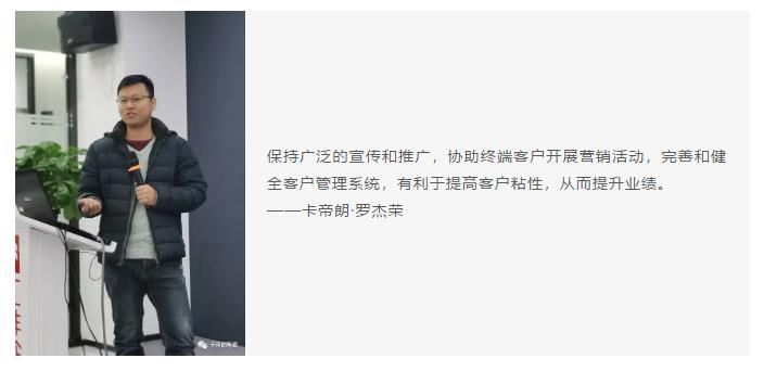 隨后,楊經(jīng)理對2021年集團內(nèi)部培訓計劃作出明確的安排。公司培訓的頻率將會有所提升,這種培訓包括了商學院培訓,或面向終端經(jīng)銷商等多種形式,而且培訓的導師將會由出色的商學院成員擔任,不在局限于推廣部。